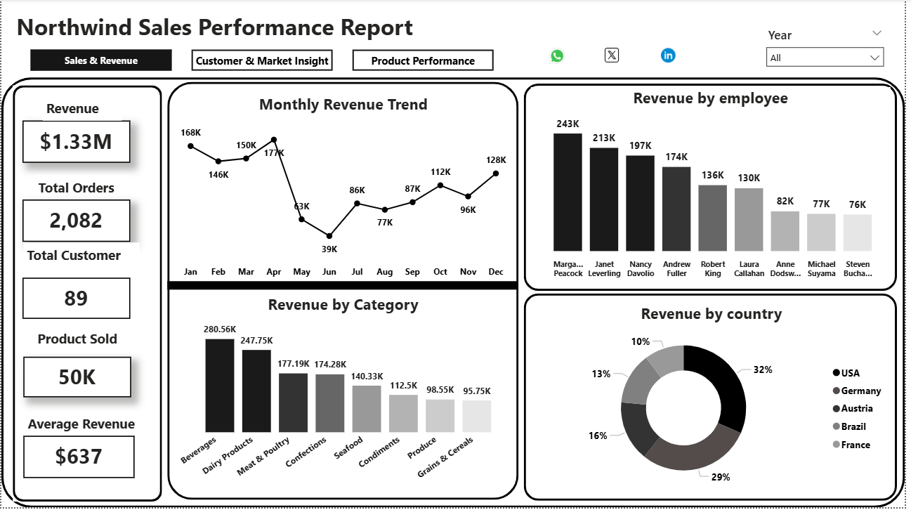 The Northwind Sales Performance Analysis project focuses on uncovering key business insights from the classic Northwind dataset. It aims to evaluate sales trends, customer behavior, product performance, and employee contributions to overall revenue.