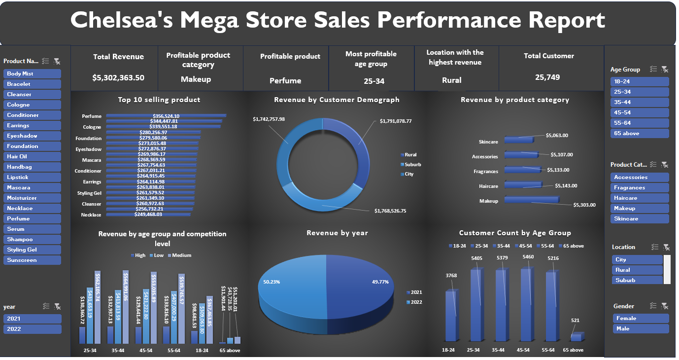 This project involves analyzing two years of sales data from Chelsea’s Mega Store, a retail and personal care business. Using Microsoft Excel, I created an interactive dashboard that tracks key performance metrics, including total revenue, top 10 selling products, customer demographics, product category performance, and yearly revenue distribution.