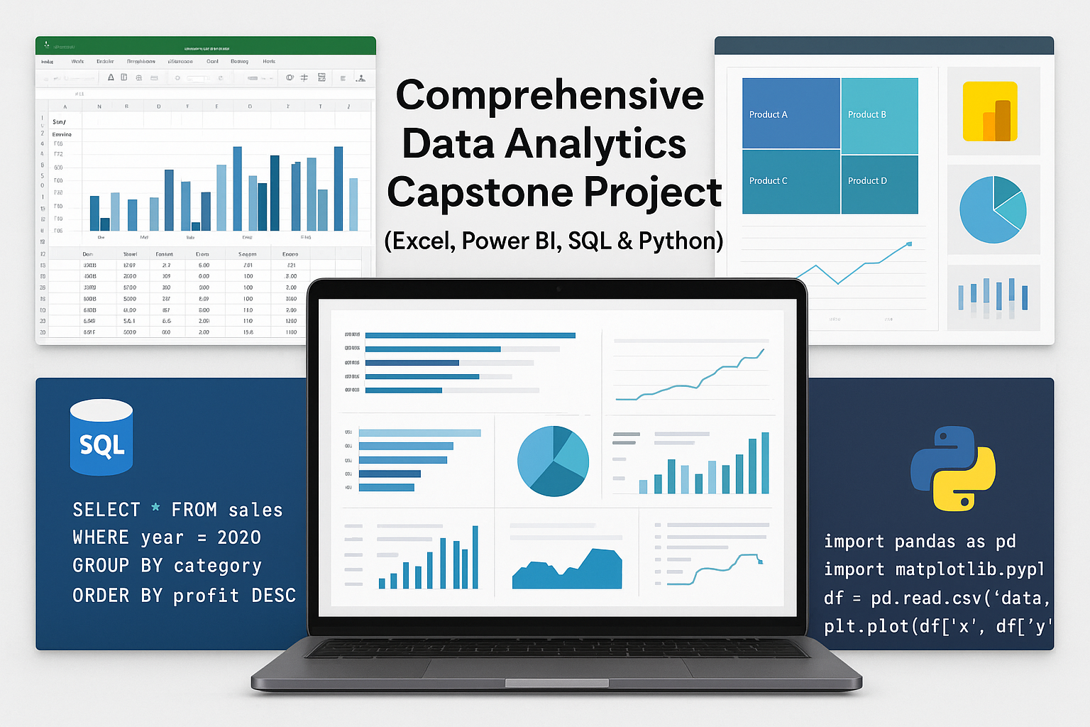 This capstone project demonstrates end-to-end proficiency in data analytics using Microsoft Excel, Power BI, SQL, and Python. Each project showcases practical data analysis skills — from cleaning and transformation to visualization and insight generation — applied to real-world business datasets.