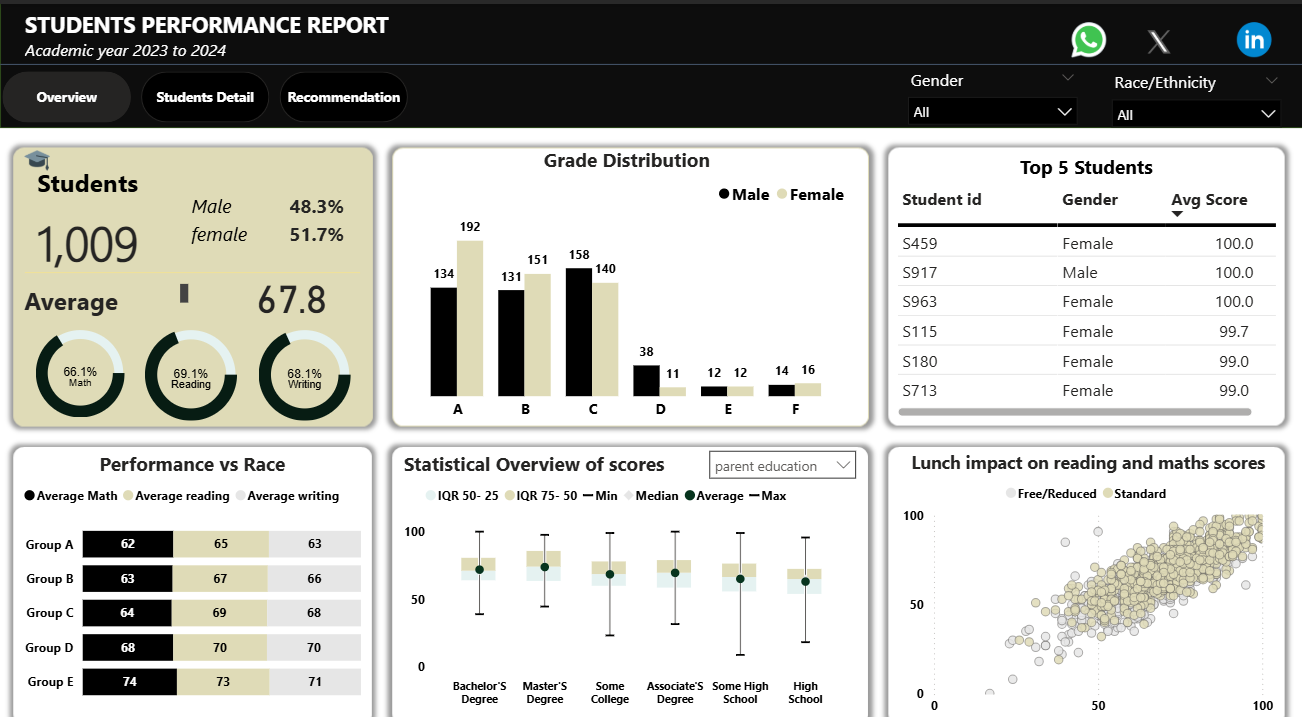 The Students Performance Analysis Dashboard is an end-to-end data analytics project designed to evaluate academic outcomes for 1,009 students during the 2023–2024 academic year. Built entirely in Microsoft Excel, the project leverages advanced data-cleaning techniques, KPI metrics, statistical analysis, and interactive visualizations to uncover the key factors influencing student achievement.